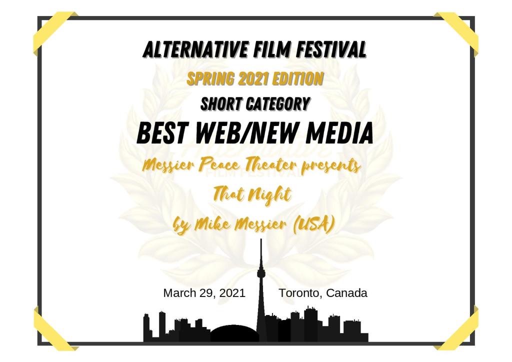 Alternative Film Festival Spring 2021 Edition names Messier Peace Theater presents That Night as Best Web/New Media Award Winner!