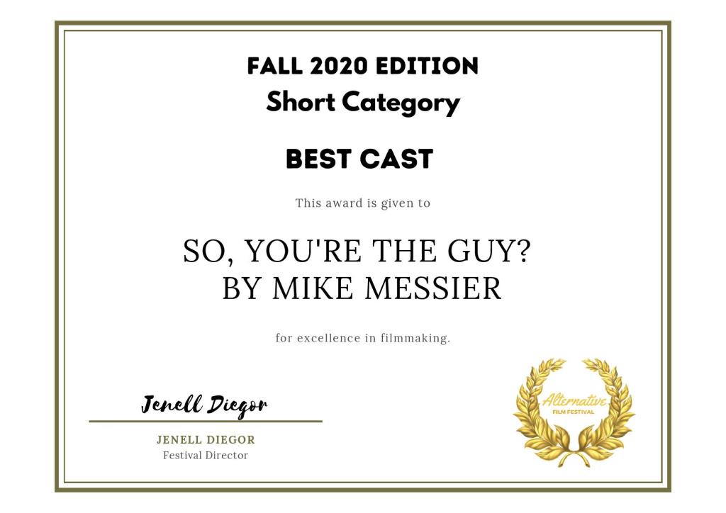 UPDATE: Happy to Announce that Nassau Film Festival https://nassaufilmfestival.org/ 2021 has Awarded the prestigious Princeton Tiger Award 2021 to So, You’re the Guy? Thanks to NFF Founder and Festival Director Lew Goldstein and his hard-working crew at the festival for this great award. In previous years, Mike was able to attend the 2017 and 2018 festivals to support his other short films “Thanksgiving” and “Breakfast with Kurt” which also won Awards at Nassau Film Festival.