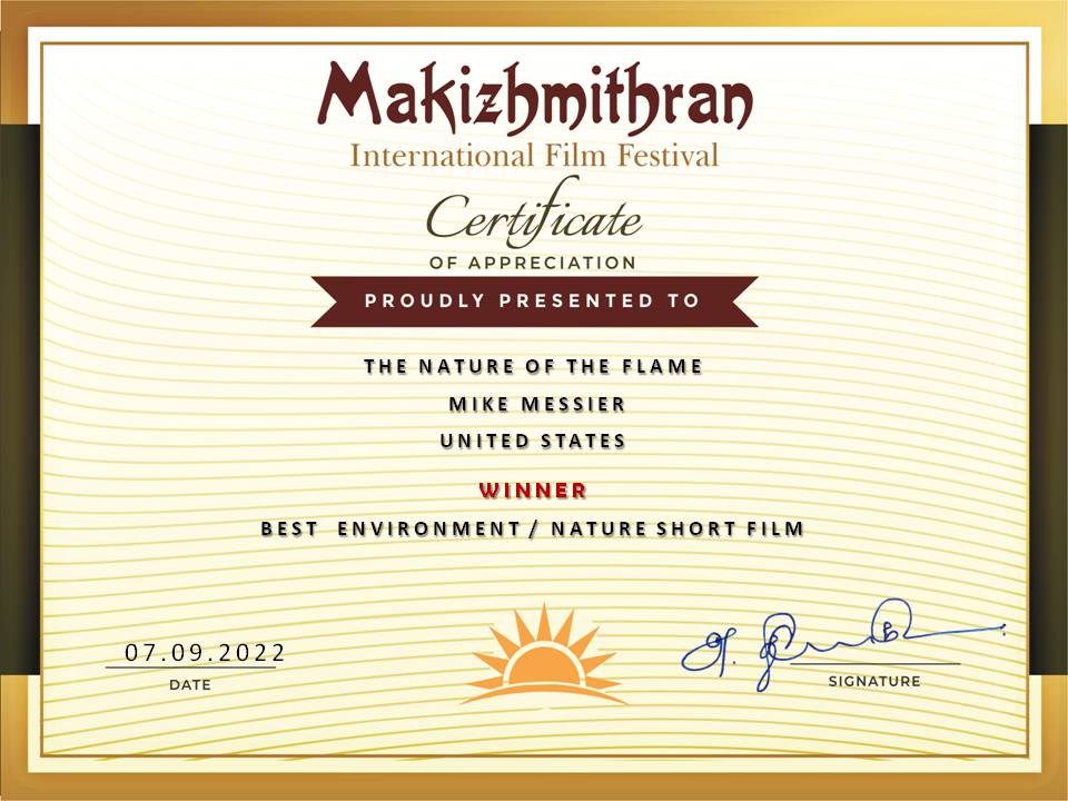 Thanks to Makizhmithran International Film Festival for naming The Nature of The Flame, written and directed by Mike Messier and filmed and edited by Chris Hunter, as its choice for Best Environment/Nature Short Film! Enjoy the film for yourself by simply pushing the YouTube Play Button above and feel free to share the link to this blog as you wish!