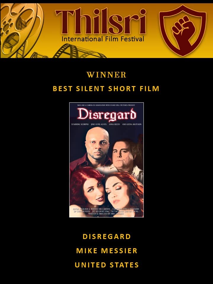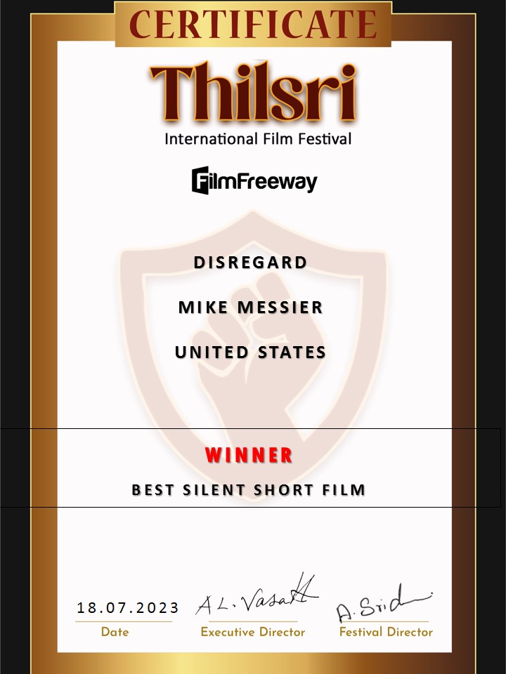 Thanks to THILSRI INTERNATIONAL FILM FESTIVAL for Awarding DISREGARD its Best Silent Short Film Award, July 2023.