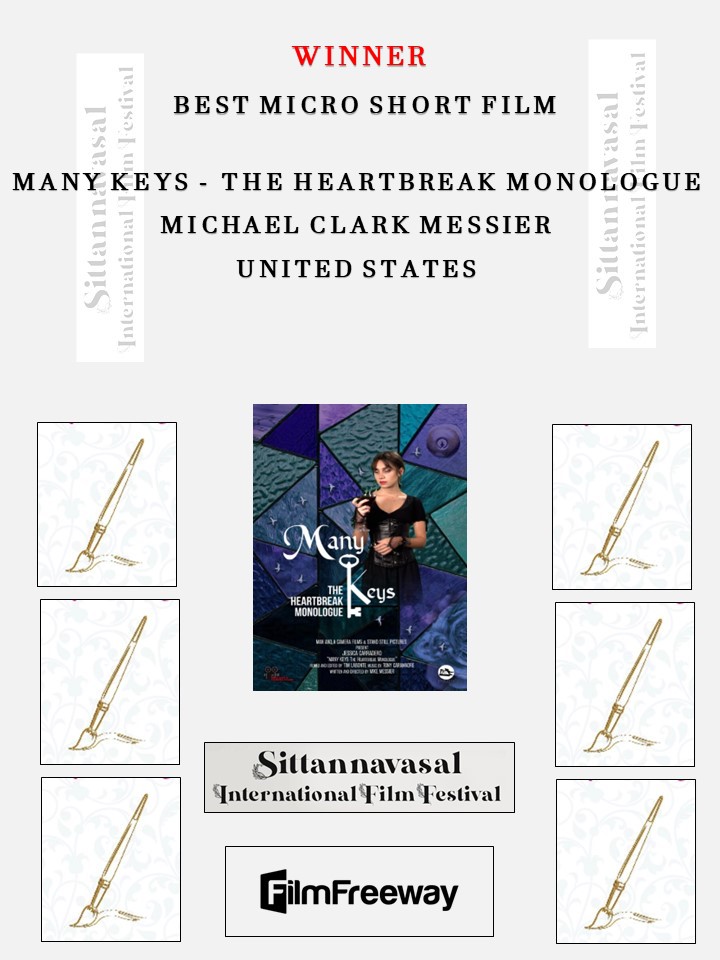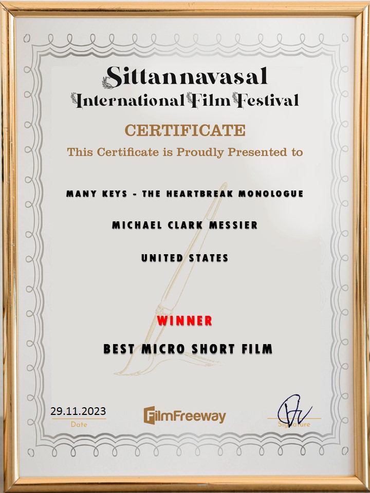 Thanks to the Sittannavasal International Film Festival for awarding Many Keys – The Heartbreak Monologue its Best Micro Short Film Award in November 2023. You can watch the five-minute short right here:
