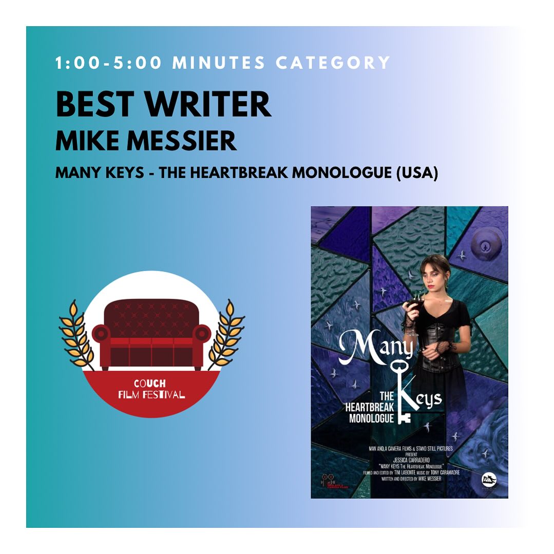 Thanks to Couch Film Festival for awarding Mike Messier’s work on Many Keys – The Heartbreak Monologue with its Winter 2023 Best Writer Award in the 1:00 – 5:00 minute division.