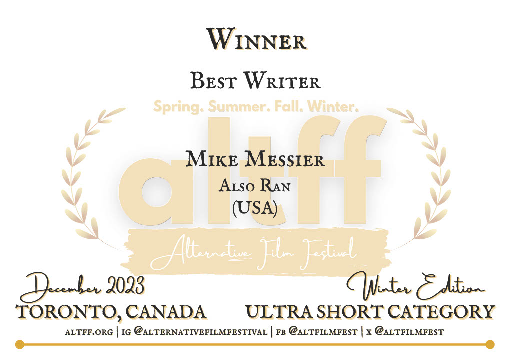 Thanks to Alternative Film Festival for the Best Writer Award for the proof-of-concept video for my feature film screenplay ALSO RAN.
