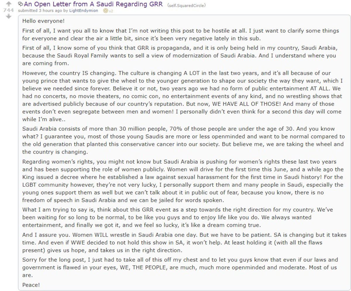 April 25, 2018 Update: Snack Society’s Will Mahoney on Twitter shared this “Open Letter from a WWE Fan living in Saudi Arabia” shared on SquaredCircle Pro Wrestling forum on Reddit, ironically a forum Mike himself is no longer allowed to post in.